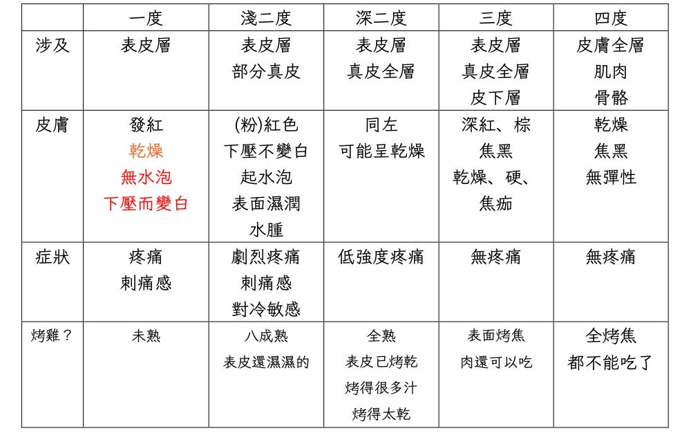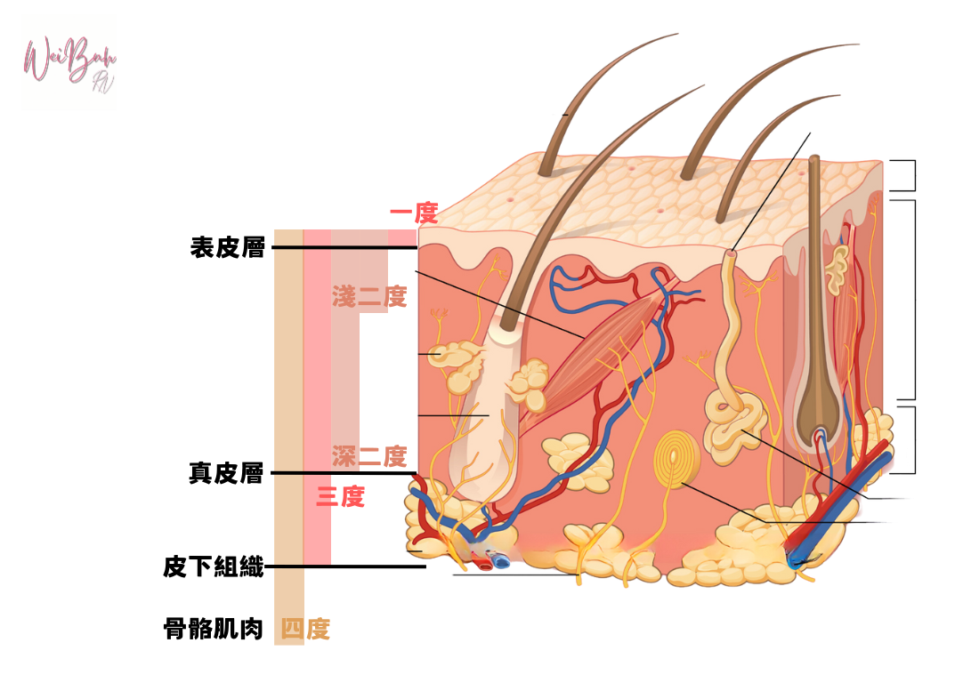 三度燒傷:全層皮膚(表皮至皮下組織)