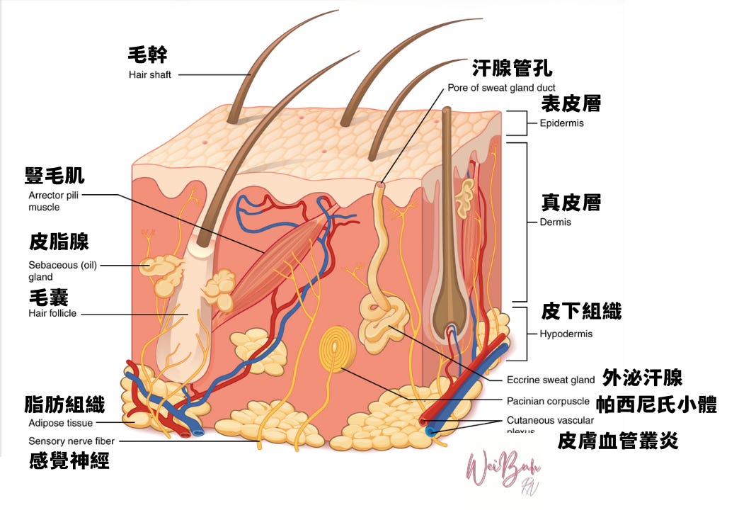 基底層:毛囊和汗腺的基底細胞,負責生成和生長新的細胞