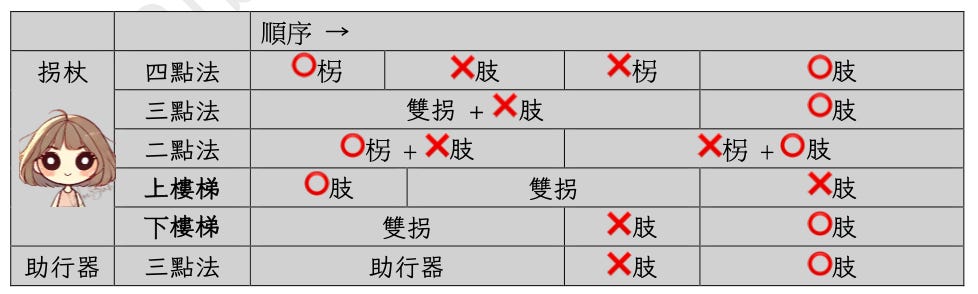 二點法:患側肢(腳)與健側柺杖 → 健側肢(腳)與患側柺杖