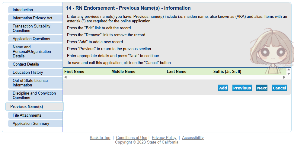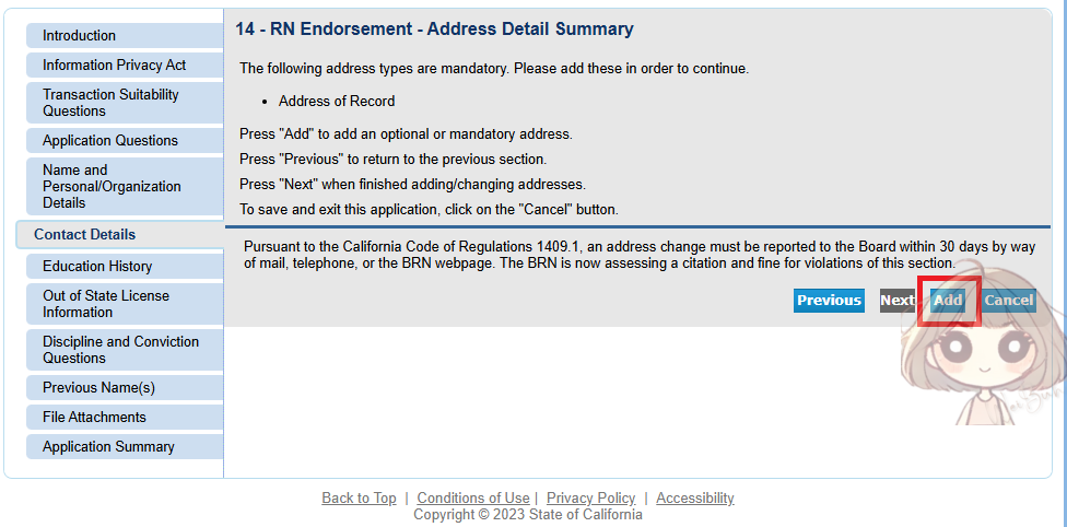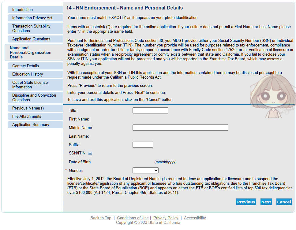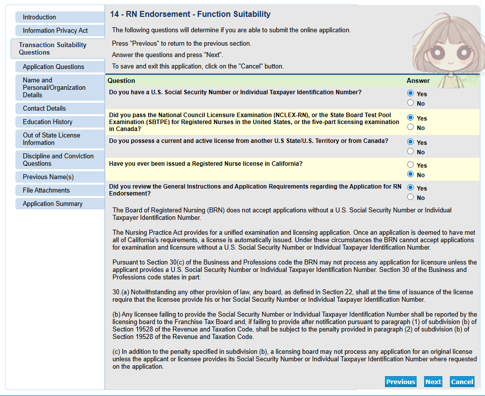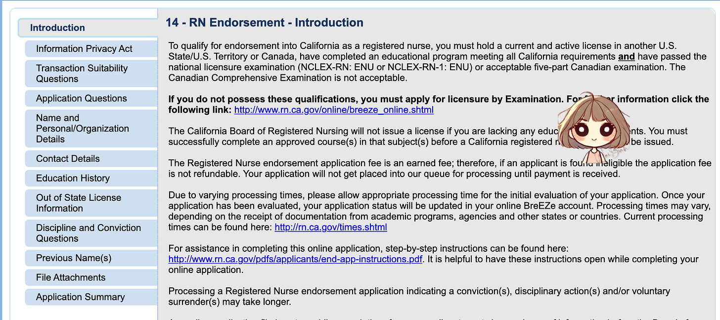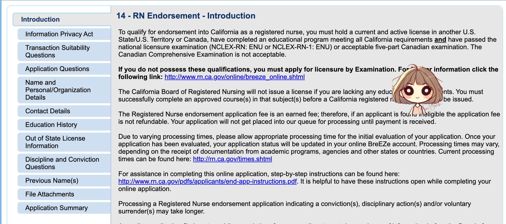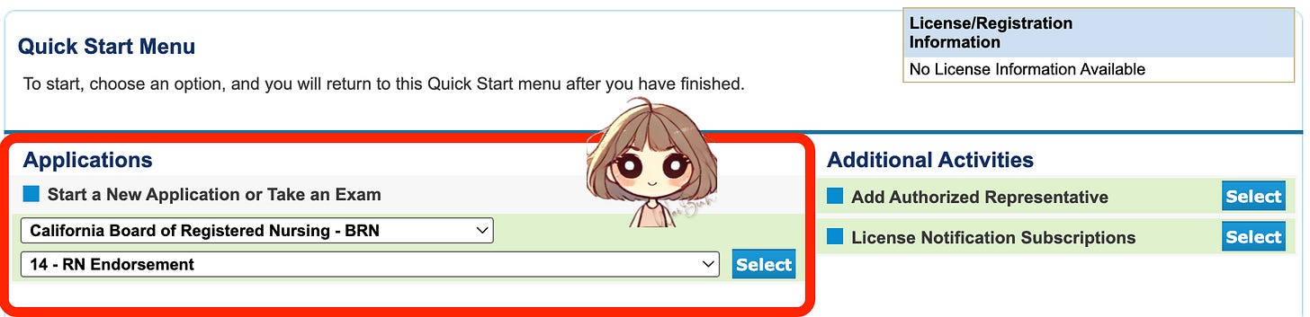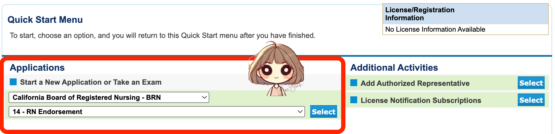 在Quick Start Menu中,選擇「Applications、Calfornia Board of Registered of Nursing - BRN、14-RN Endorsement」