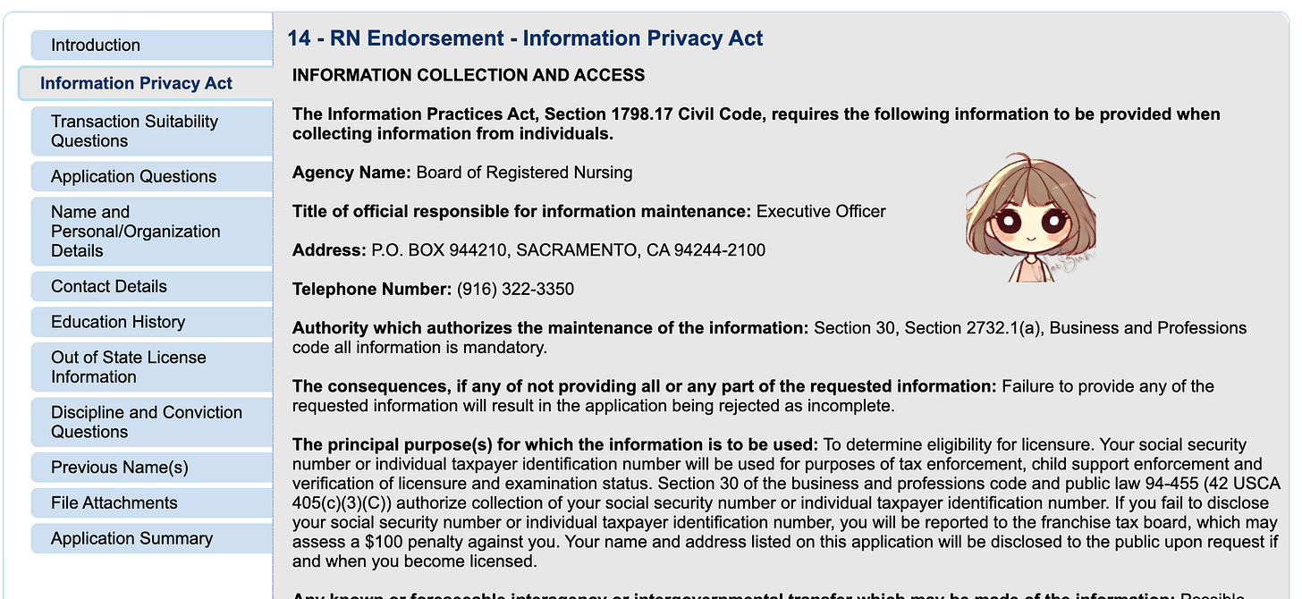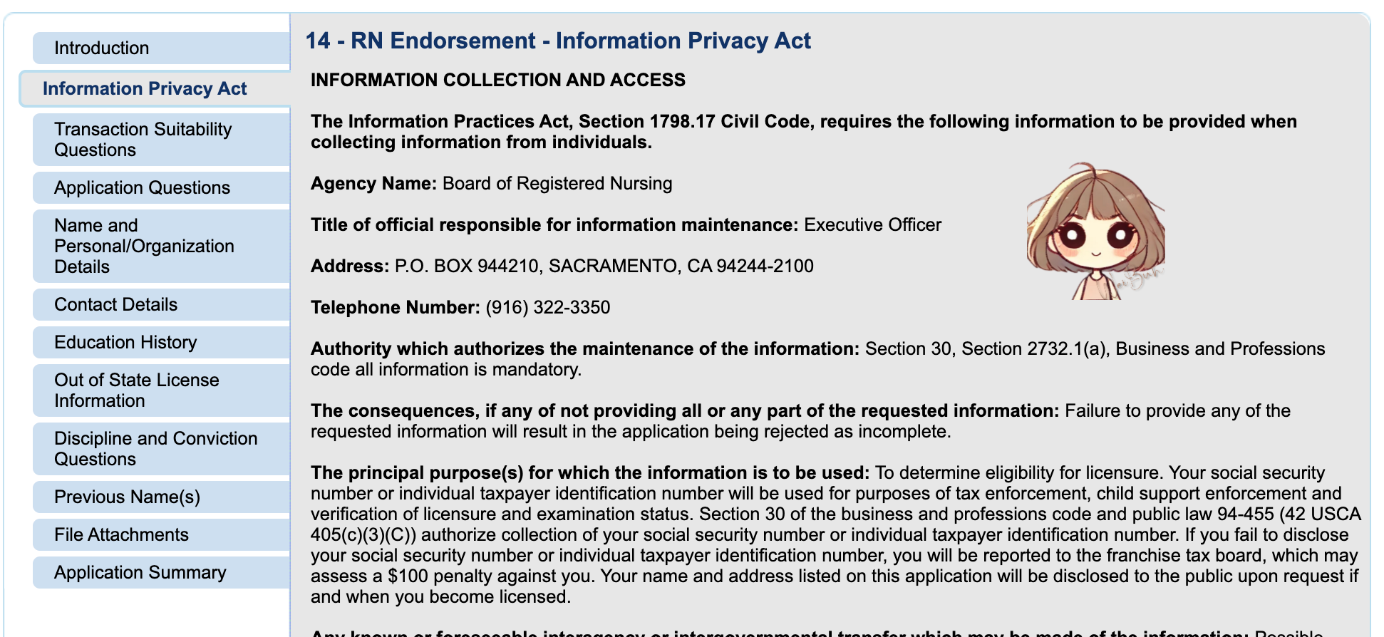 這時可以申請臨時執照,在主申請提交後,「申請RN臨時執照」(RN Request for Temporary License)的選項才會在你的BreEZe帳戶中開放。當然,最有效率的方式是在申請資格認可時一併提出臨時執照的申請