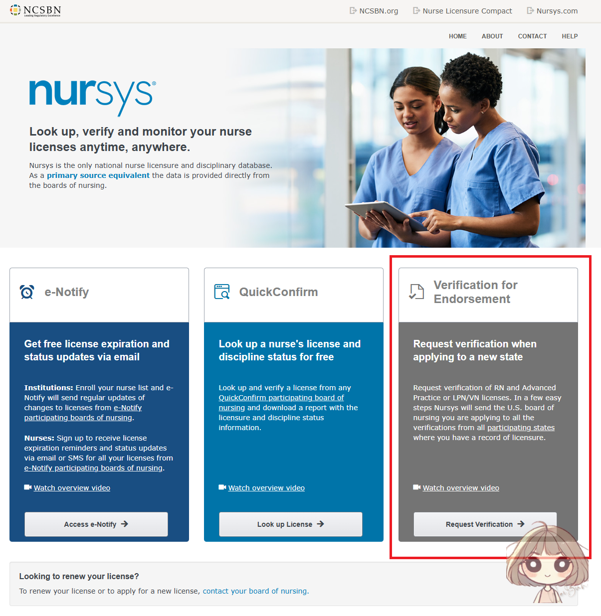 屬於全國州護理委員會(NCSBN)的部門,驗證護理師執照和紀律資料庫